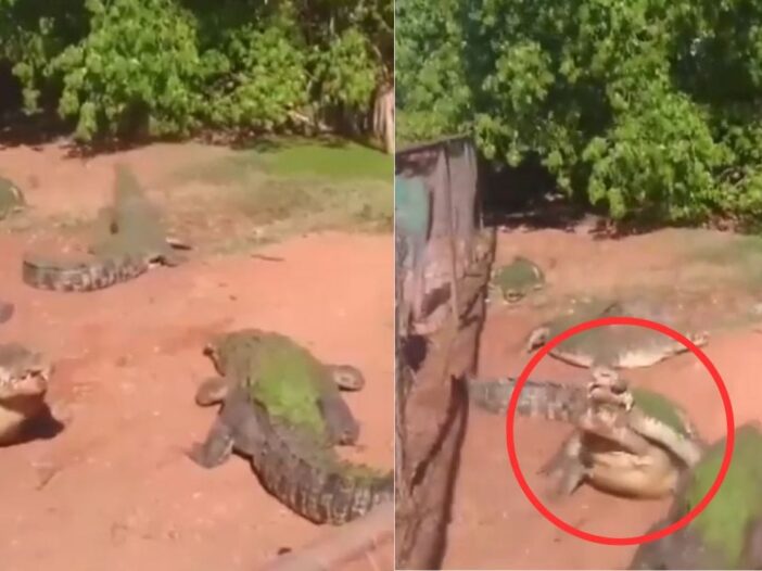 The video starts with a crocodile enclosure, where many big and small crocodiles are resting. Meanwhile, the atmosphere suddenly changes when a caretaker throws a big piece of meat inside for them to eat. Now suddenly seeing food creates a stir among the crocodiles. Everyone starts moving towards that piece of meat, but in the meantime there is a confusion. A crocodile accidentally grabs the leg of another crocodile in its jaws because it thinks that some prey has come near it. Then what, he becomes violent and cuts off his partner’s leg and eats it. This scene is very scary.