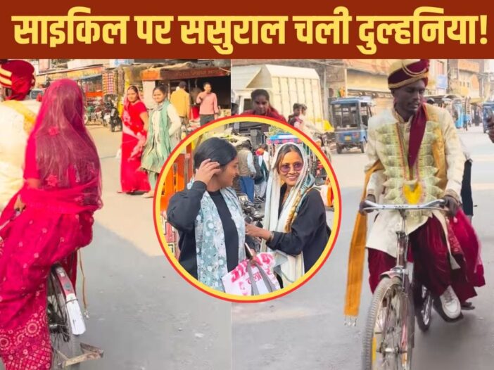 There was a time when grooms used to go to marriage on bicycle or bullock cart, but now times have changed a lot. Now big and expensive cars are seen in weddings. Although on social media a video viral What is happening has reminded people of old times. Actually, in this video, the groom is seen taking his bride not on a bike, car or horse but on a bicycle. Whoever saw this scene burst into laughter.