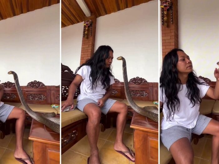 In this video going viral, a huge king cobra is sitting on the table with its hood spread. Right in front of her, a person is smiling and making eye contact with her. The cobra looks very big and scary, but there is not even a trace of fear on the person’s face.